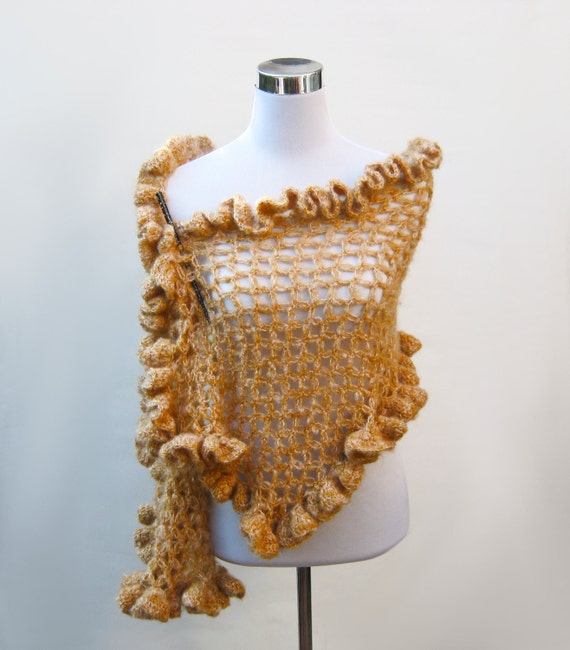 Crochet stole shawl ruffle frilly scarf glamorous handmade mohair look wrap in mustard gold.