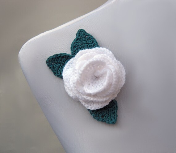 White rose brooch pin retro corsage handmade crochet flower with teal leaves.