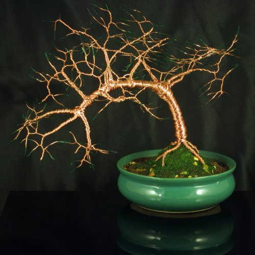 Wire sculpted Copper Wire tree in the Bonsai Style in a matching green pot.
