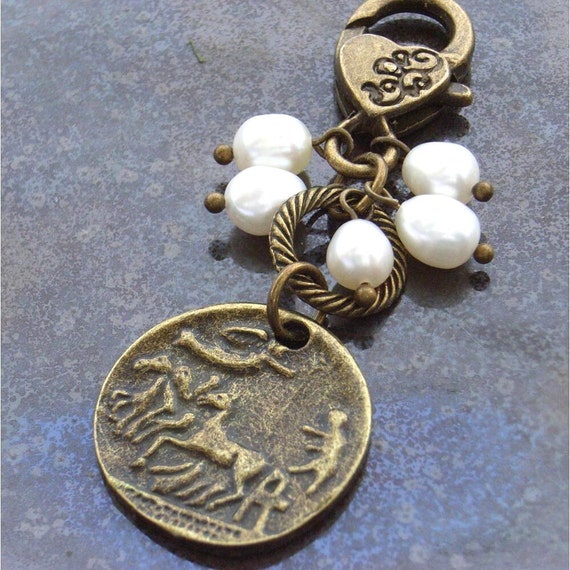Purse or bag charm coin with freshwater pearls with a great vintage, steampunk style. This little beauty has a profile ...