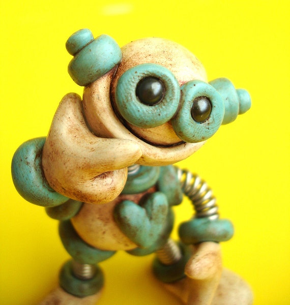 Robot Sculpture Blue Benji Grungy Bot Polymer by RobotsAreAwesome