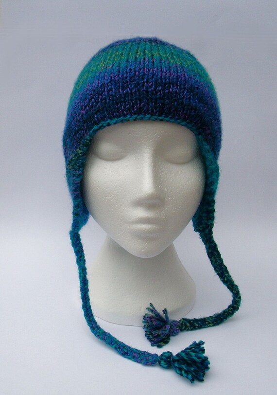 Ear flap hat handmade striped multicolor ski hat with tassel earflaps knit hat.