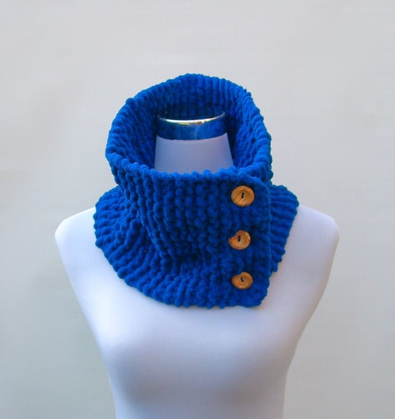 Cobalt blue cowl scarf chunky knit neck warmer handmade in soft chenille with wooden buttons.