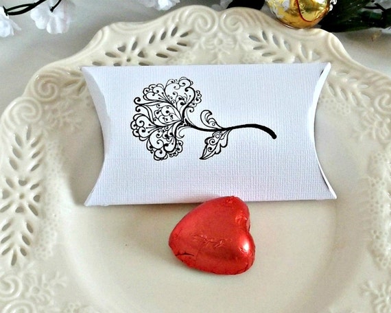 This listing is for 10 pillow boxes. They are handstamped with a filigree rose. These lovely boxes are just perfect for any occasion. They can hold candy, jewelry, or any other gift you want to offer. All you have to do is fill them and voila. Don't even need to tie them to keep them closed.Site: