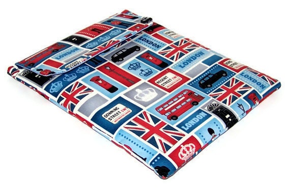 Padded Ipad Sleeve featuring Union Jacks, Red Telephone Boxes, Royal Crowns, 10 Downing Street, Royal Guardsmen, Red Letter Boxes, Black Cabs, Red London Buses, Regent Street, Oxford Street, Bond Street, and Gaslights, all on a pale blue background.Site: