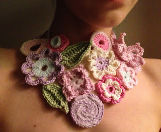 Crocheted collar necklace made up of individual flowers and a 3D butterfly. I have used pastel colours as my inspiration ...