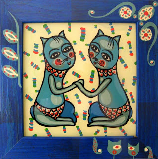 "Cats under the Blue Moon" is an original acrylic painting on glass with a wooden frame also painted.