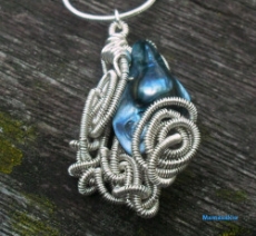 One of a kind silver plated wire wrapped pendant with a special shaped Mother of Pearl bead in blue. The ...