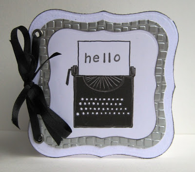 A cute little note card featuring a silver embossed background and a little typewriter (Tiddly Inks image) with a stamped ...