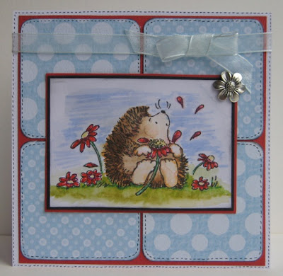 A wonderful handcoloured image of a hedgehog ski-ing downhill rather fast! With red raffia, embossing and glitter detail. Card is ...