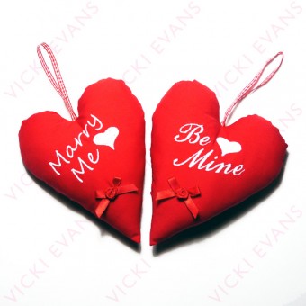 Embroidered messages on red love hearts. Choices include Marry Me, Be Mine, I Love You, Love You To The Moon ...