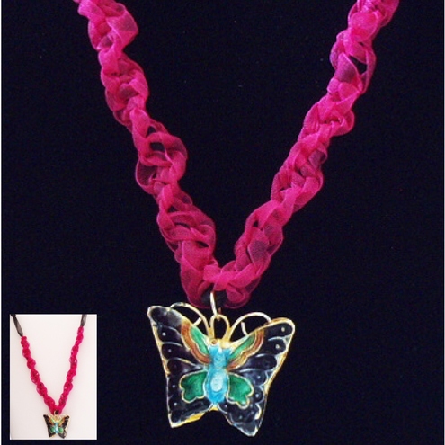 I made this necklace from organza ribbon. The hot pink contrasts amazingly with the black and sets off the cloisonne ...