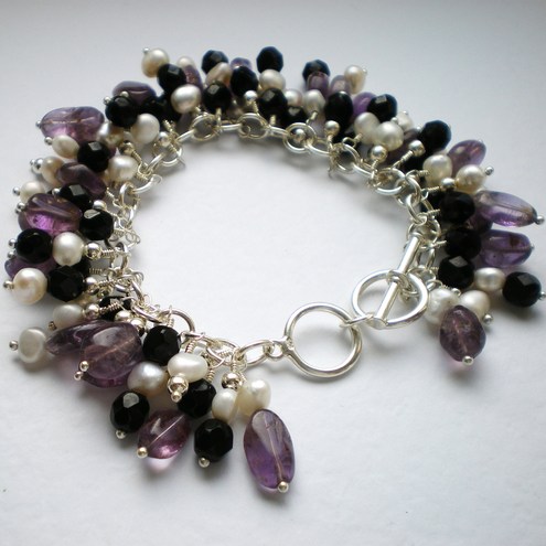 A beautiful fluid bracelet with white freshwater pearls, amethyst drops and jet czech fire polish glass. The dangles are attached ...
