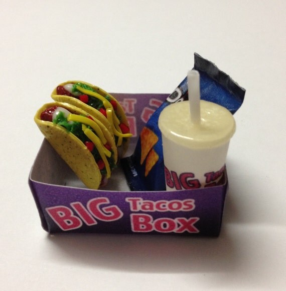 Miniature taco box handmade from polymer clay and paper. Treat your dolls to some tacos and Doritos chip! Included are 2 ...