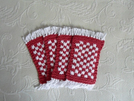 Mug Rug Knit Coasters Terracotta Red and White by babystepsnmore