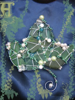 This is a broch made of green seaglass pieces wired up with silver wire and decorated with beads and pearls. ...