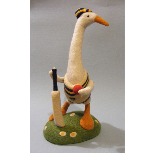A needle felt goose with moveable limbs