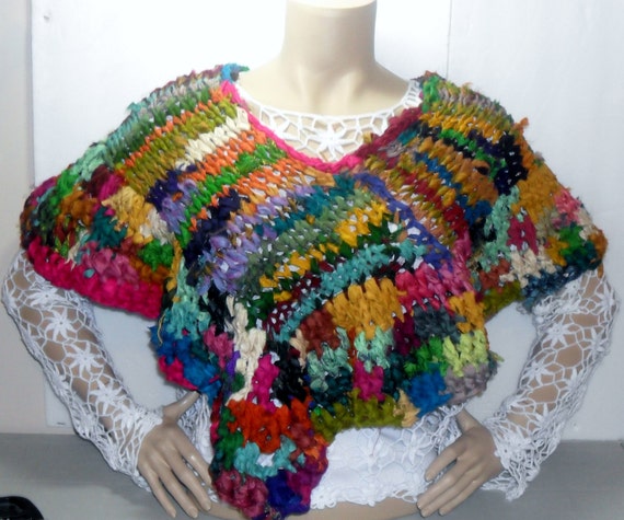 Poncho/Caplet. Made from upcycled sari silk ribbon. Knitted collar and crocheted body. A great companion to wear casually with ...